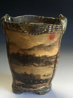 My art work consists of 2D and 3D mixed media. The base and framework is clay and to that I add paintings I have done and patterns I have stamped. My paintings have been done using inks on rice paper and then I adhere them onto clay frames or clay objects. Many of these pieces have added fabric, pieces of metal or wood as texture or ornamentation.